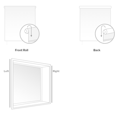 ![]() | Decide on a Roll Direction, this refers to the direction the fabric rolls off the tube. Front Roll means fabric will roll off the tube towards the room. Back Roll means the fabric will roll back towards the window. Back Roll is always recommended for an outside fitted blind, as you want the fabric to roll backwards close to the frame. Front Roll is the best option for inside fit if you want to avoid window latches and door handles. If you are ordering a Thermal Blockout or Designer Roller back roll, please check what colour the back of the fabric is. Whatever the back of the fabric colour is, you will see this across the top of the roll once installed. Some fabrics have off-white coatings and some have coloured coatings. Decide on a Chain Side, usually the most convenient side to get to. |