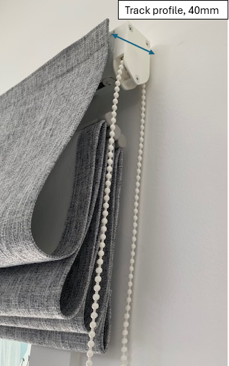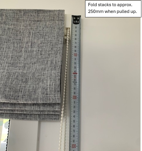 Romans must be measured as an outside fit. Only exceptional circumstances will Romans fit inside the frame, please contact us before ordering if this applies to you. Fitting Romans 100mm above the frame is standard as there should be solid fixing to screw into. Some fabric will cover the top of your frame when blind is fully pulled up. Whereas fitting Romans 250mm above means fabric should clear most of the frame, as the finished fold when pulled up approximately stacks to 250mm. Our chain operated Roman track has a 40mm profile, therefore holds the fabric 40mm off the wall. Consider selecting a chain length about 2/3rd the height of the blind.